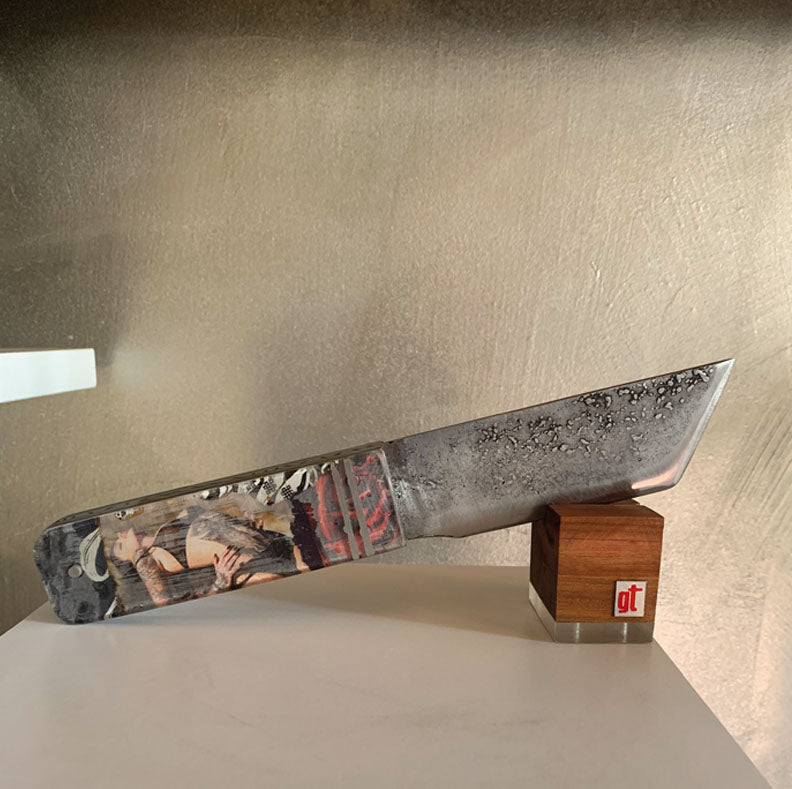 Support : Lame acier, manche Plexiglas, Alu, étain, et son support en Quetschier et plexi.